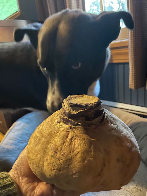 I was also amused to note that the etymology of rutabaga contains roots meaning “root” and “bag.” So aptly named. I think my rutabaga should be the poster child for rutabaga etymology.