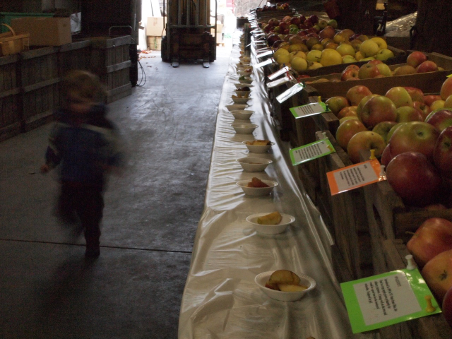 While many of the trees had long ago finished dropping apples, there were several varieties that were still going strong. Among them, Empire apples, which is possibly my favorite variety. They are tart and crisp when freshly picked, make a very smooth buttery-textured apple sauce, yet keep firm enough when cooked to work in apple crisp. Empires are a cross between McIntosh and Red Delicious, neither of which I actually particularly like. I find that McIntoshes get pretty mealy, and unless very freshly picked, I don’t like them for anything beyond making apple sauce. (They also tend to get too mushy when cooked for apple crisp.) And Red Delicious? What can I say. Possibly my least favorite apple variety. Ubiquitous in school cafeterias and sorry hotel buffets, they are often mealy and sickly sweet without a hint of tartness, and with a bitterness to the skin that makes me gag. They are useless for cooking because they are too firm, plus they don’t taste good. It is a complete mystery to me how these two lackluster parents could have produced such outstanding offspring.