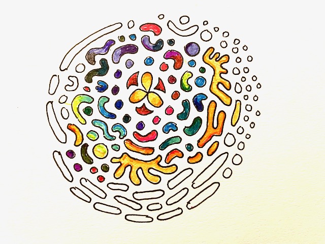 On Monday night, when John and Phoebe were out at their karate classes, Theo asked me to sit and draw with him. I drew the doodle above with colored pencils on a large index card, and found it to be very relaxing. I must have spent over an hour just drawing and coloring it, transferring much of the tension of the day into pressure of the pencils as I lay down the swirls and twists of color. It was only later that night that I realized how very intestine-like my drawing turned out to be! Twisty, turny, tangled and complicated. Much like life.
