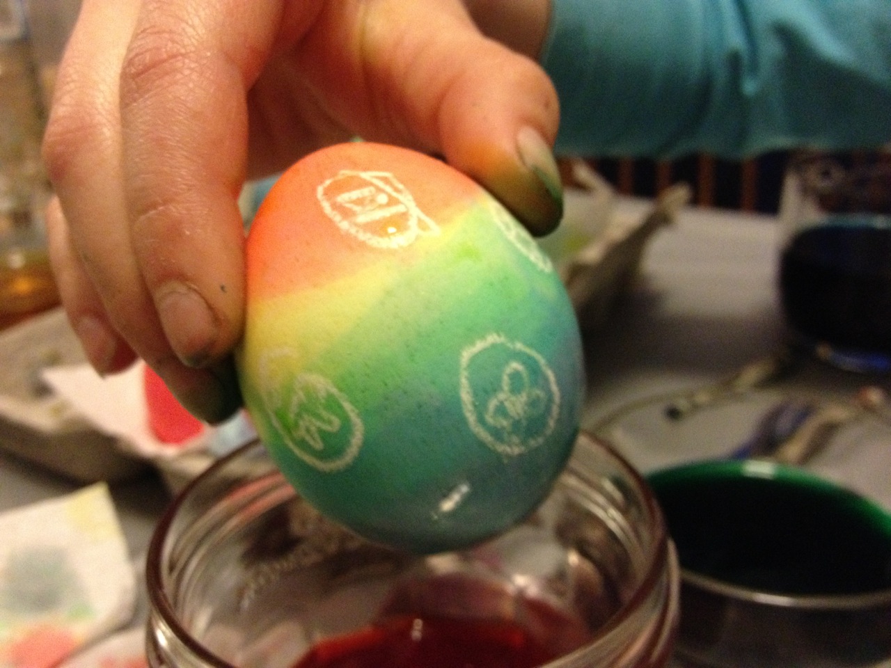 In the process, I realized why it is that it helps to add vinegar to dye eggs. Egg shells are composed primarily of calcium carbonate. Calcium carbonate is commonly used to neutralize acidity and raise the pH level: it is the main ingredient of antacids such as Tums, as well as agricultural lime. Acids can dissolve calcium carbonate. I’m guessing that adding vinegar starts to break down the egg shell, allowing the color to permeate and bond more quickly to the shell.