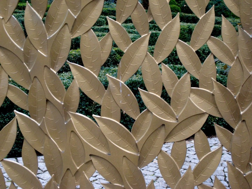 2007: Saarbrücken, Germany. I liked this leafy gate, which enticingly showed glimpses of a hedge maze behind it. (Attempts to photograph said hedge maze in the fading light with the little point-and-shoot I used at the time were blurrily unsuccessful. Here they are, tiny so as to hide the blur: