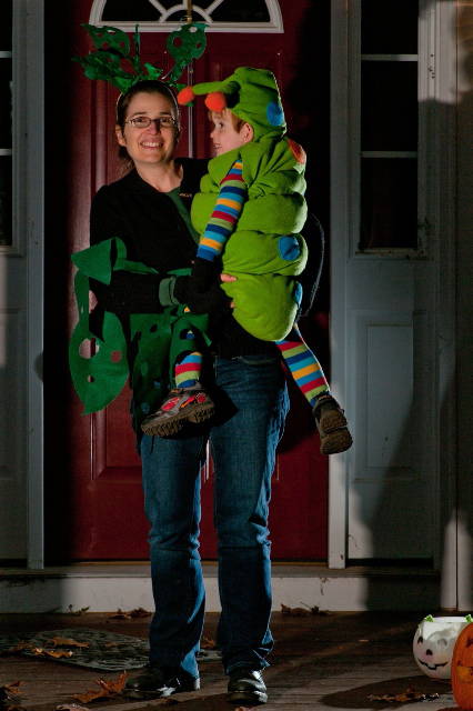 My tree costume (which you can see a bit of over at John’s) was an old standby of mine, a creation I’m quite proud of. I wear all brown, wear a twig wreath on my head with a few leaves, and drape some fall leaf garlands around my shoulders. The costume was not only easy to put together, but since I happen to have various plain dark brown clothing items to disguise my body as the tree trunk, it was cheap. It only cost me about $10.00 to buy the leaves and wreath at a craft store.