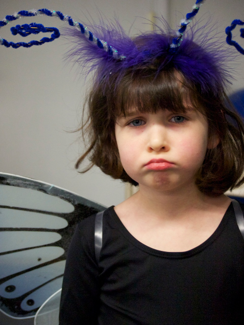 D: Decide on a theme for your kids’ costumes months before Halloween based on some accessory you’d gotten on sale a couple of years before, and plant the seed of the idea in your kids’ heads so that they think they want to be those things. Decide that you want to make as much of their costumes as you can. Less than a week before Halloween, buy a sewing machine, even though you haven’t used one since junior high. Figure out how to use it, including doing types of things that you’d never even done in home ec. classes. Spend a bit of time each night working out the design of a costume. The night before you plan to use the costumes, stay up past 2 in the morning. Work for a couple more hours the next day getting ready for your afternoon departure to a place where the kids will be in costume, including stitching on some proper straps to the accessory you’d bought a couple years ago because the glue is coming apart and one of the cheap plastic straps has already come loose. Continue to work on the other costume in the passenger seat on your way to the Halloween event, sewing on embellishments until your fingers are so sore and tired that you drop a needle in your lap while trying to thread it just one more time, and then spend the rest of the ride trying to find the damn needle, and convincing yourself that you will either be sitting on it, or poking a small child with it in the near future. Spend even more time finishing up the costume the next day, and then make a costume for yourself while your youngest child is napping. In the end, you are still vaguely unsatisfied, because there are a few details you never found time for, and getting kids to cooperate for photos is really tricky, so none of it looks quite how you imagined it anyhow.