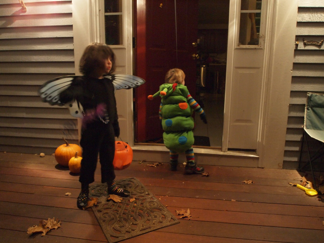 Phoebe had decide a few months ago that she wanted to be a witch, and I heartily approved. I thought I might be able to make her a dress. But then I was shopping at the second hand children’s store (and no, they don’t sell second hand children), I found a witch’s dress and hat on the rack. In Phoebe’s size. Since I had made a point of not asking Theo about what he wanted to be (in part so that I could have a chance to run with a theme, and in part because I didn’t want to get stuck committing to something tricky when he’s not likely to even remember this costume by the time he’s 6), I didn’t have anything particular in mind for him. I thought I could go with another traditional Halloweeny costume (ghost, mummy, frankenstein, bat…), but didn’t find any such costumes on the rack in his size. I did, however, find a rather cute green frog. Theo likes frogs. And green. I bought it.