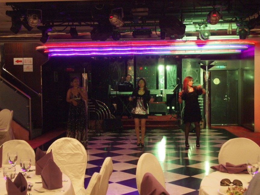 For entertainment, we were treated to earnestly sung lounge music versions of pop tunes, from Wham to Lady Gaga. (The singers were so very earnest.) The spacious dance floor offered plenty of room for people to awkwardly skirt around while trying to reach the exit stairs.