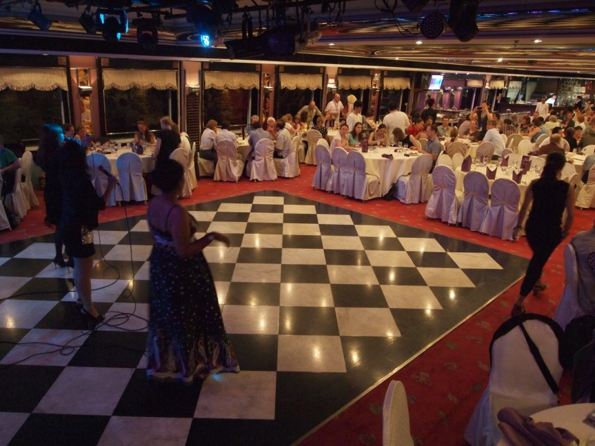 When I headed back down to main deck, the “fun” had really started. The dinner buffet was open, and there was live entertainment. I don’t have any photos of the food, but just try to imagine yesterday’s cafeteria food presented as ostentatiously as possible. The copious offerings included bad day-old overchilled sushi, bad reheated Indian food, as well as a host of other mediocre-looking probably-leftover international delights. For those wanting lighter fare, there was a variety of salads featuring freshly-opened canned vegetables.