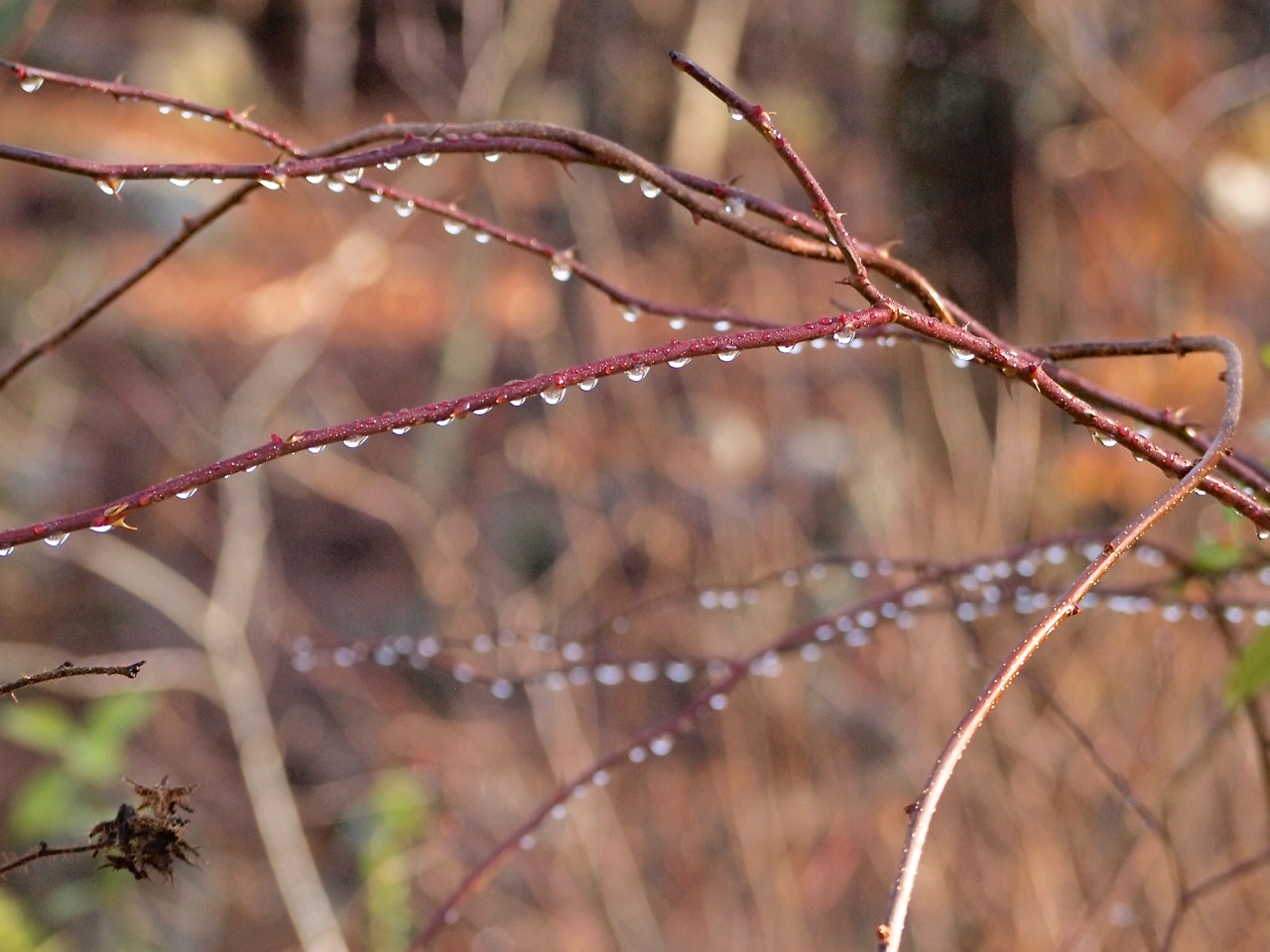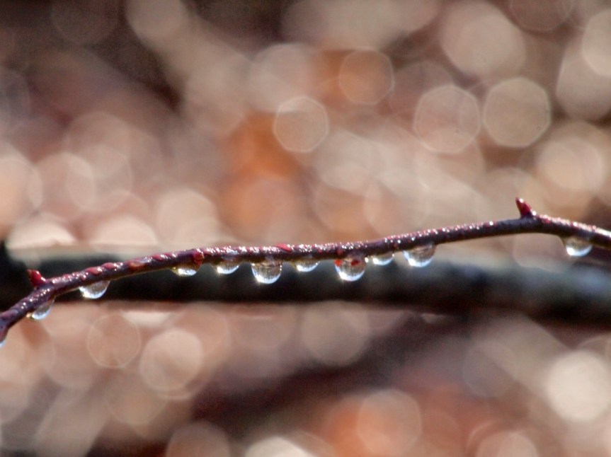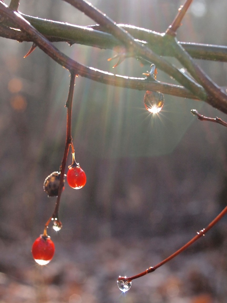 After bustling the kids out to the bus, I walked down the driveway to be greeted by a display of glittering light. The sprinkling of freezing rain the night before had left droplets of ice and water decorating the tangled vines and thorns of our overgrown garden.