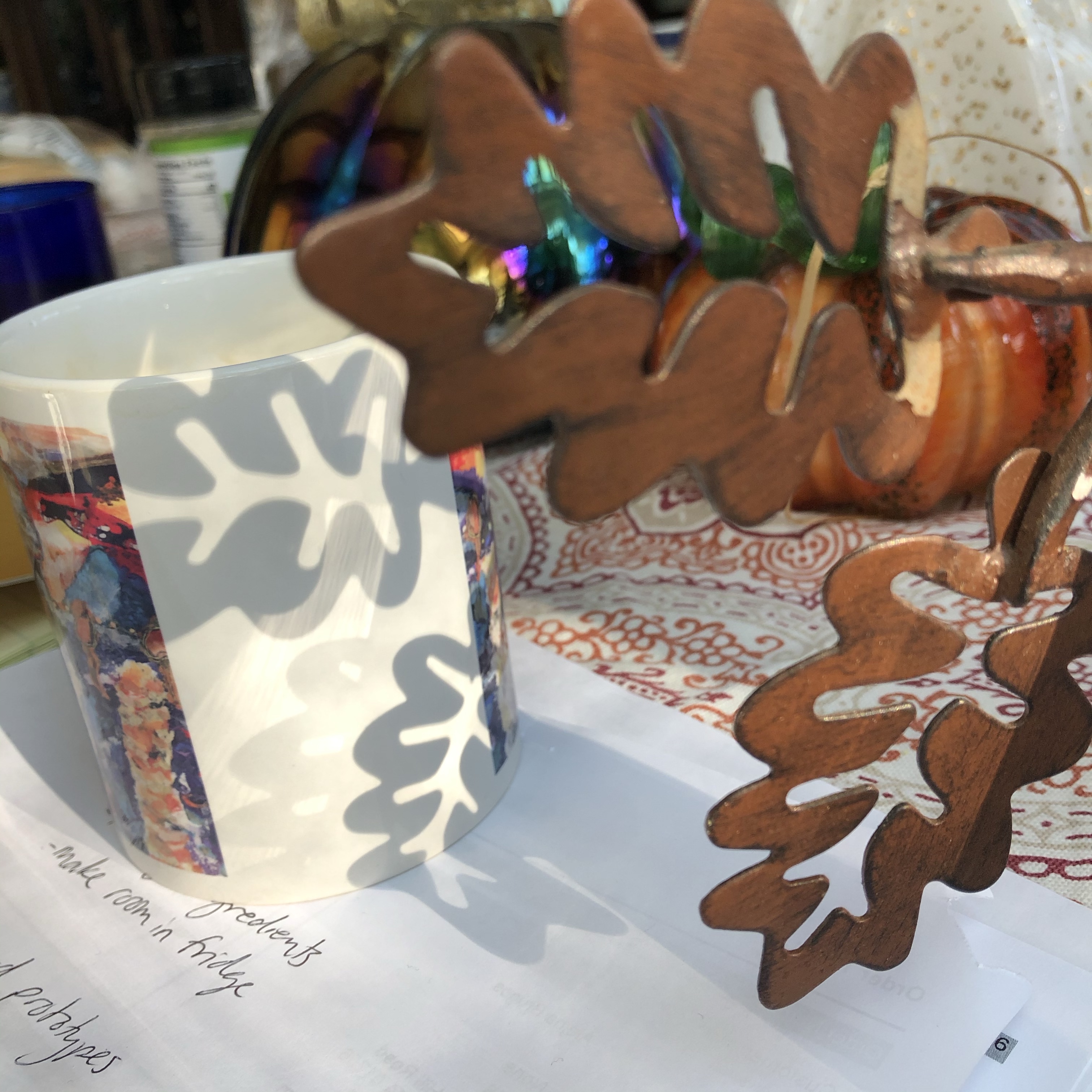 These metal leaves are a decoration I recently got at a thrift store. (My daughter and I have discovered a mutual enthusiasm for going to thrift stores. Possibly too much enthusiasm.) Anyhow, the leaves cast some fun shadows in the low afternoon light. I enjoyed seeing how they changed (sharp above, doubled below) with the changing light.