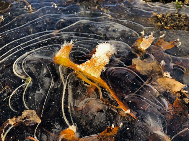 This was a puddle from a few weeks ago, frozen in my driveway. It has long since melted and dried out, but its image gets to stay frozen in time. I love the rippling patterns of the ice, as well as the delicate little frost embellishments adorning the leaves.