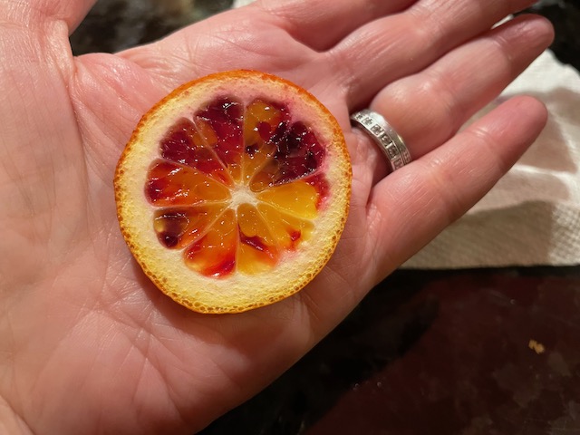 Shortly after I posted last night (hitting the publish button at 11:59 p.m. or so), I headed to get ready for bed. I started by removing the necklace that I had chosen to wear. As I looked down at the pendant in my hand, the stone evoked the image of the slice of blood orange I had just shared in my post minutes earlier.