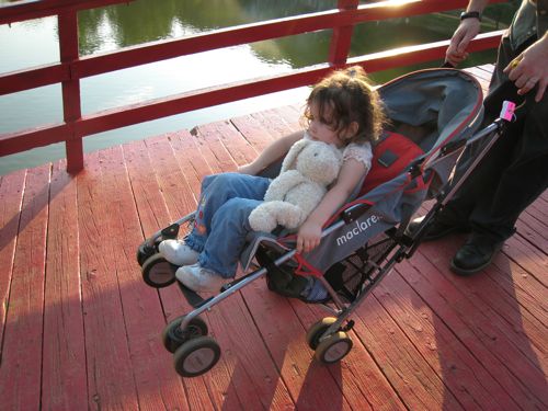 And to warm and brighten things up a bit more, I offer photos of Phoebe, looking regal as she is wheeled (along with her Bunny-Bunny-Bunny) across the steeply sloping bridge.