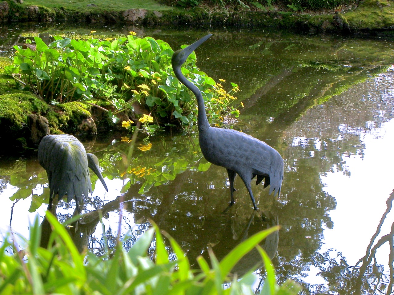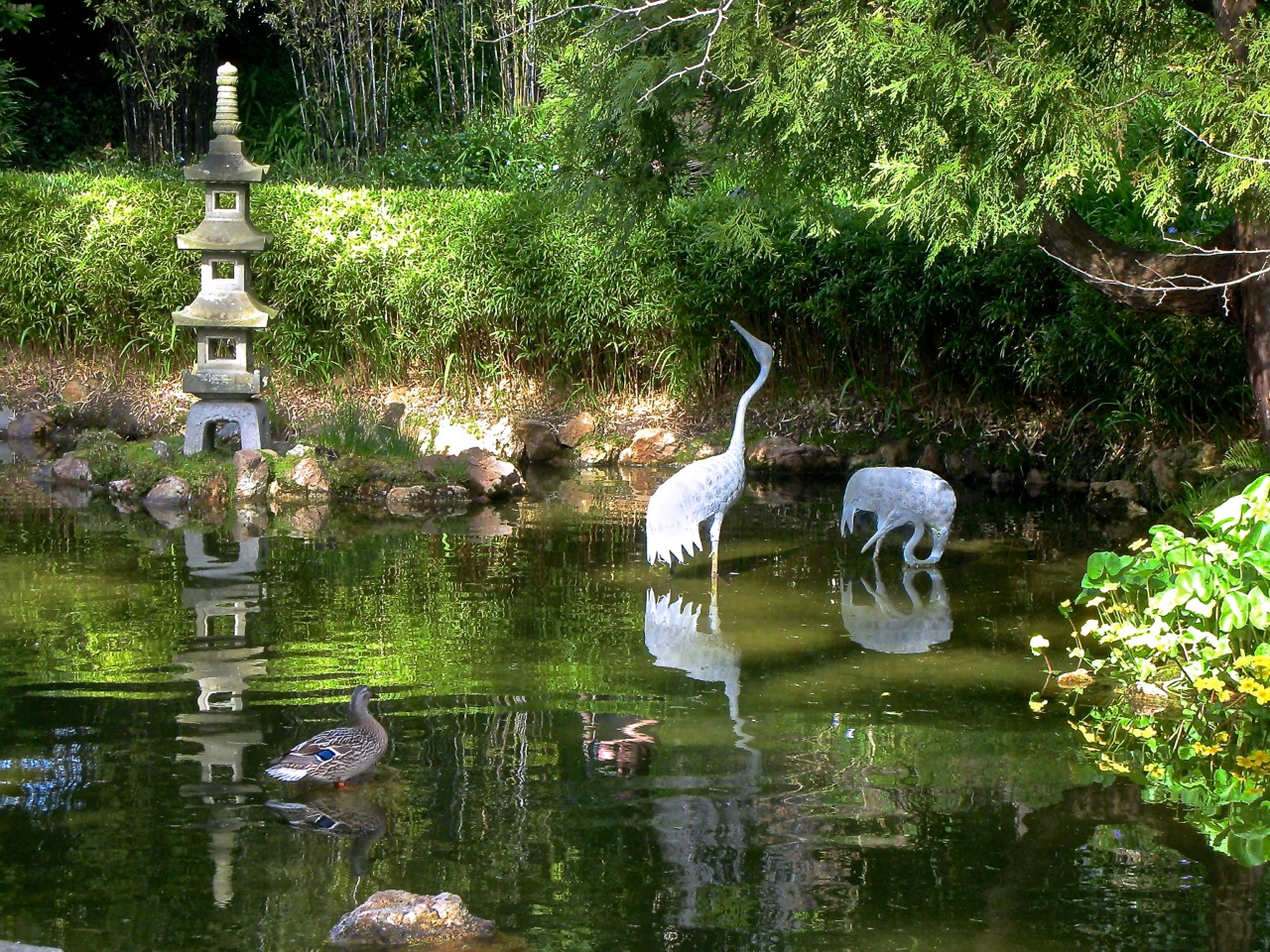 These feathered metal cranes can be found in the koi pond of the Japanese Tea Garden in Golden Gate Park in San Francisco.