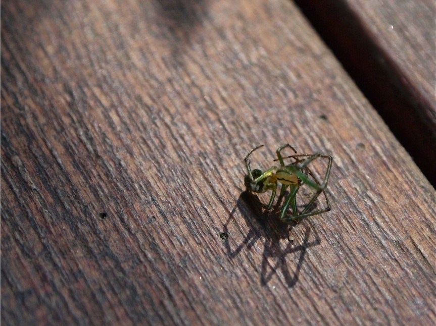 What looked to be shaped like a rather large mosquito, with a body perhaps a centimeter long, was affixed to the abdomen of the small green spider. I could see slight movement from the pair, and as I looked closer, I could see fluid moving and pulsing in the insect’s translucent abdomen as it drained the spider.