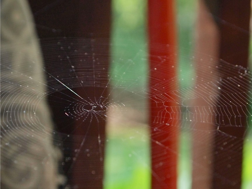 This afternoon, when I stepped out on my front porch, the glint of a new spiderweb caught my eye. (I knew it was a fairly new web, as it was connected to some things I had moved around in the last week or so.) I looked at it admiringly, and saw that the spider appeared to have caught an insect. They hung there together in the center of the web.