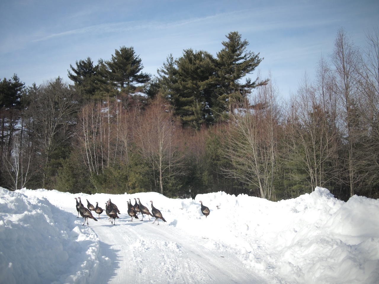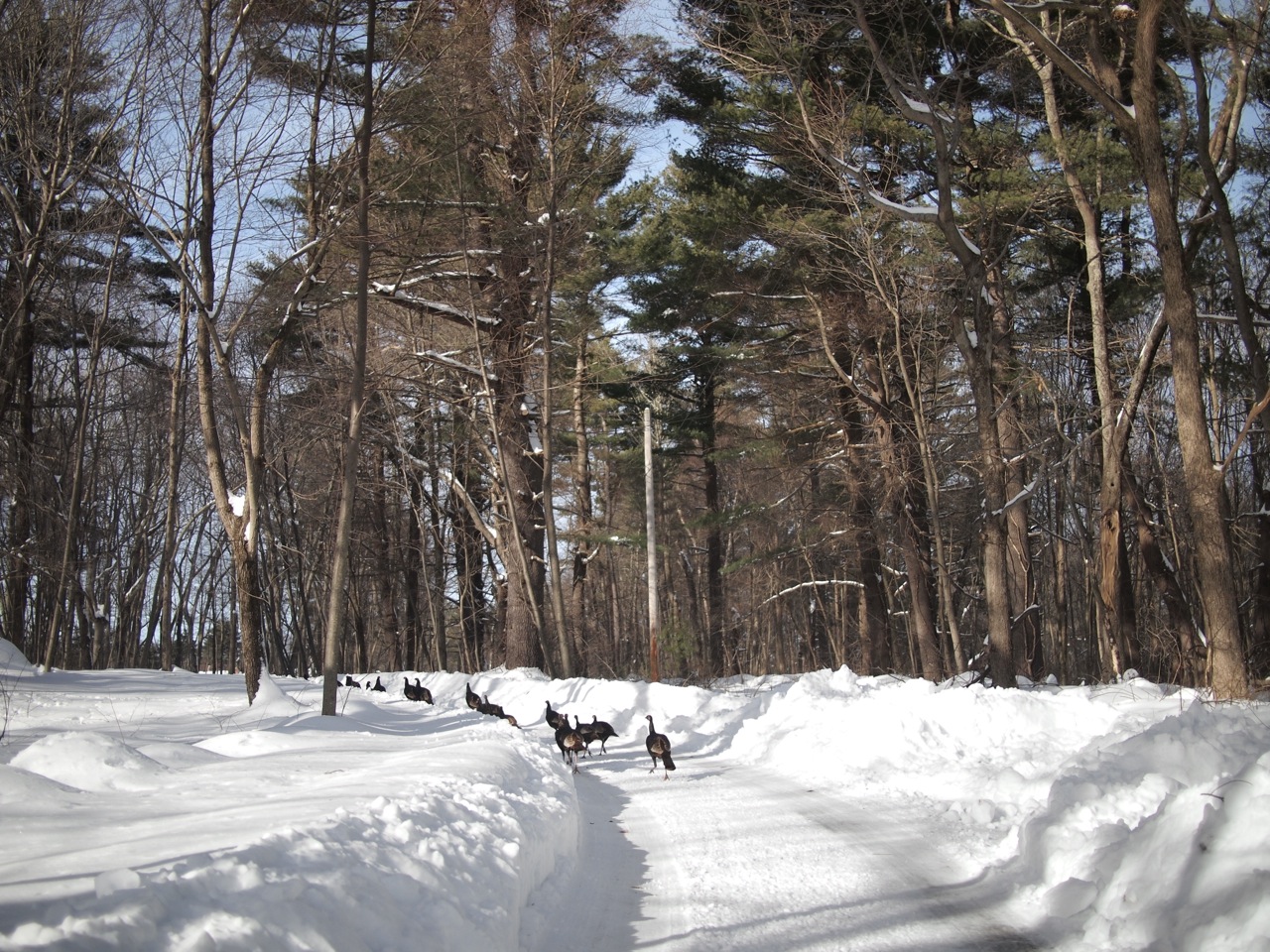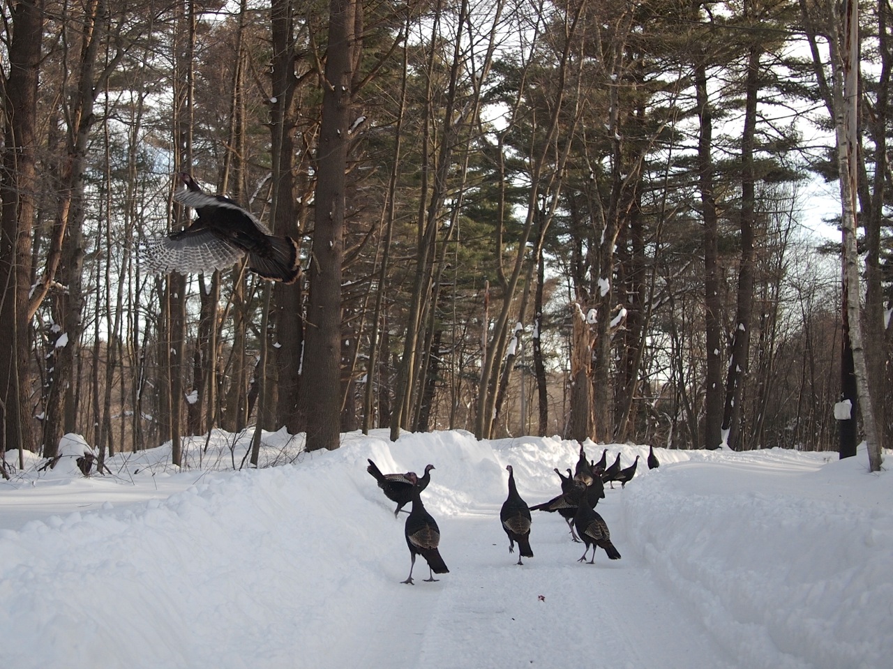 Here in New England, it is not uncommon to come across roving flocks of wild turkeys. I came across these guys a couple years ago while heading to a nearby farm to buy some eggs. (Chicken eggs, mind you.) They were in the long winding driveway, and as I drove up, they just kept running ahead, seemingly reluctant to spend the extra energy to get over the towering snowbanks. (That was the winter of Too Much Winter.) All the way at the top of the hill, they figured I was in it for the long chase, and took flight.